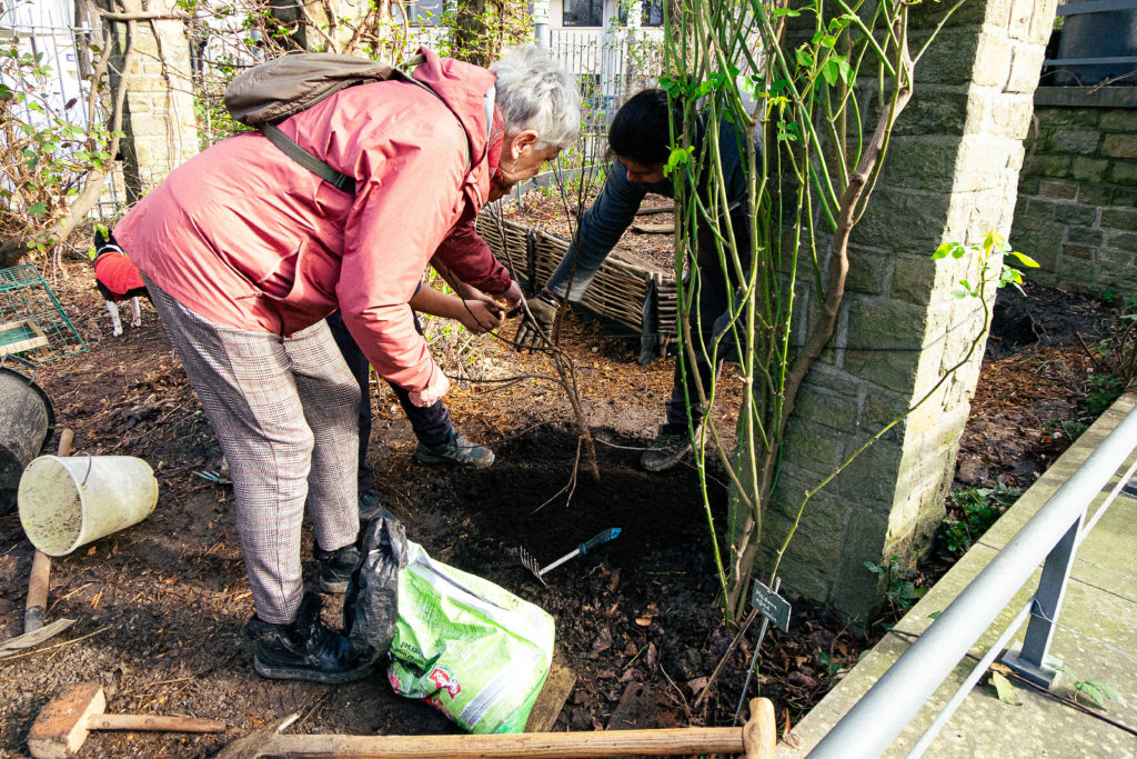 Au programme du jour, planter un abricotier, qui viendra compléter une longue liste d’arbres fruitiers : framboisier, prunelier, cerisier, mûrier, cognassier. Deux jeunes frères kurdes, venus de la Chaussée de Louvain, travaillent pour huit euros de l’heure, payés grâce aux subsides que reçoit le collectif. « Normalement, on ne peut pas les payer mais on le fait quand même », lâche Danielle. Les deux jeunes se donnent à fond et font preuve d’inventivité. Pour déplacer le pot où se trouve l’arbre, ils utilisent une poutre pour le faire coulisser sur l’escalier. « Ils sont formidables » dit Danielle, en les regardant admirativement comme une grand-mère regarderait ses petits-enfants quand ils ont bien réussi à l’école. Elle aurait envie de faire participer plus de jeunes à la vie du potager. Le problème, c’est que deux personnes suffisent pour faire tout le travail. Il n’y a pas tant des tâches à faire que ça.
