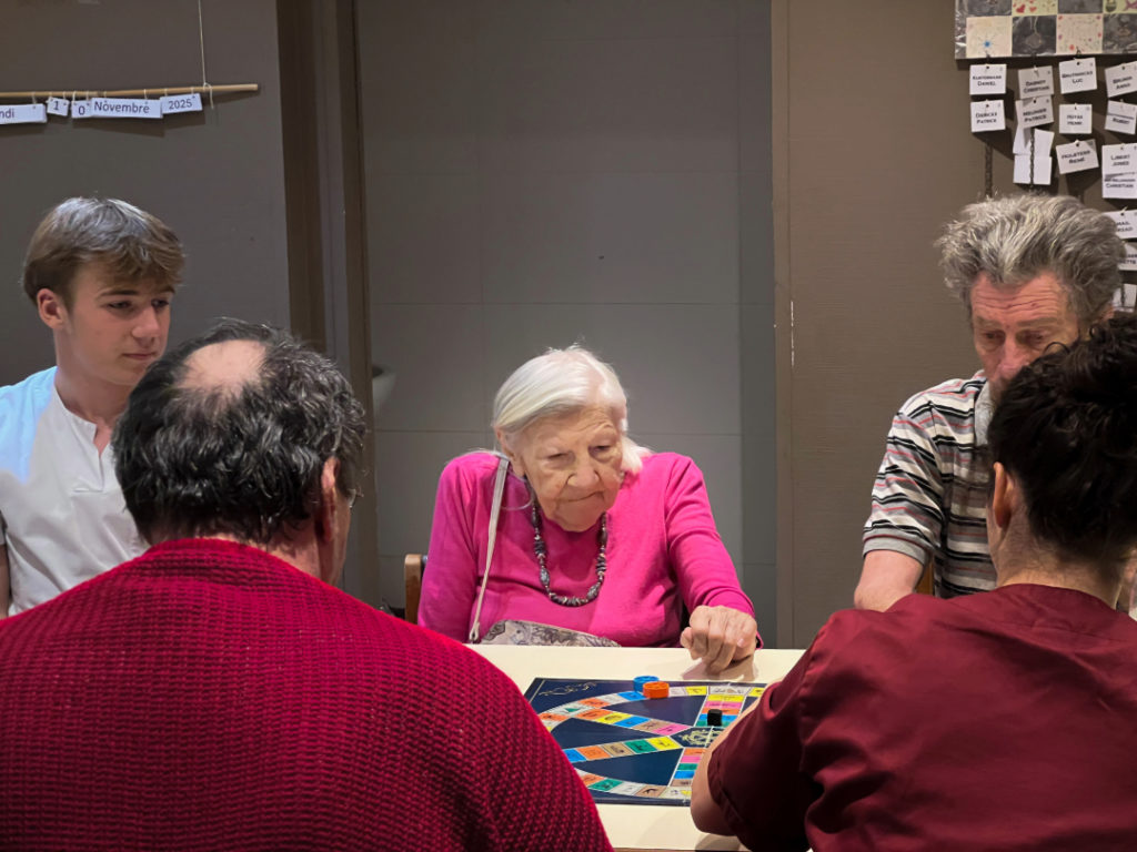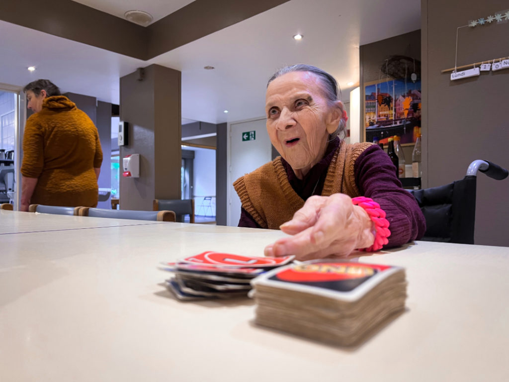 Une partie d’UNO s’improvise en attendant 14h. Elle anime même dans les heures creuses. Mais pour elle, ce n’est pas une corvée, elle y prend un réel plaisir. Ici on joue avec les règles des seniors. Un +2 sur un +4 sur un + 4 de nouveau sur un +2 et Yvonne doit maintenant piocher 12 cartes. Pierre plaisante : “Surveillez-la, elle va encore tricher !”