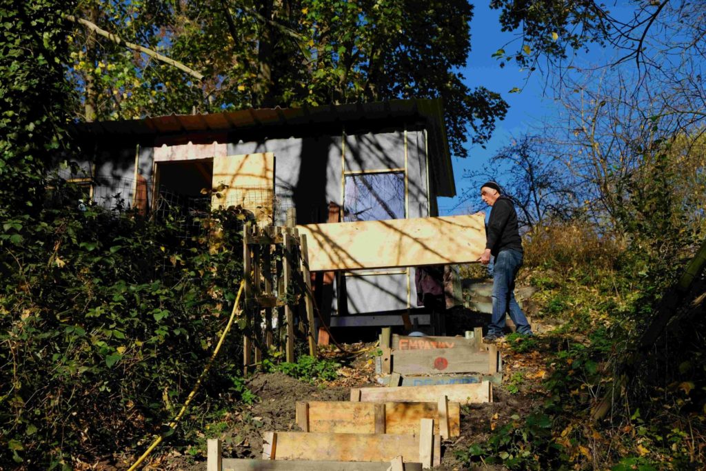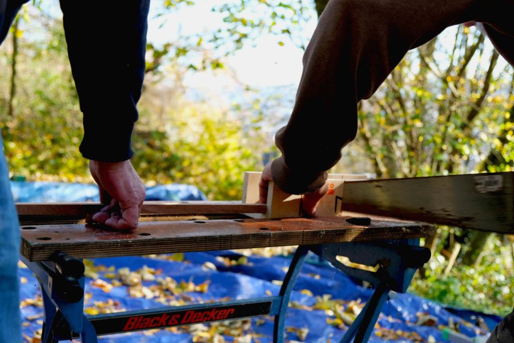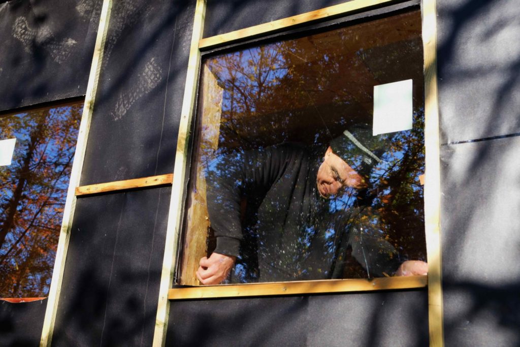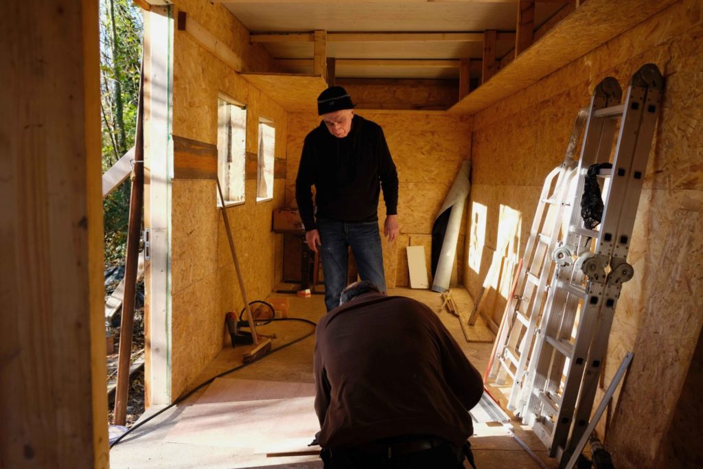 À mon arrivée, tout le monde s’affaire déjà. Gino, l’ébéniste, découpe des planches pour les finitions des fenêtres de la tiny, épaulé par son acolyte, Valéry. Ancien sans-abri, Valéry ne manque jamais une occasion de donner un coup de main. C’est même lui qui règle l’abonnement téléphonique de plusieurs habitants des coteaux. Philippe est là aussi évidemment. En chef de chantier confiant, il gère sa petite équipe de travailleurs.