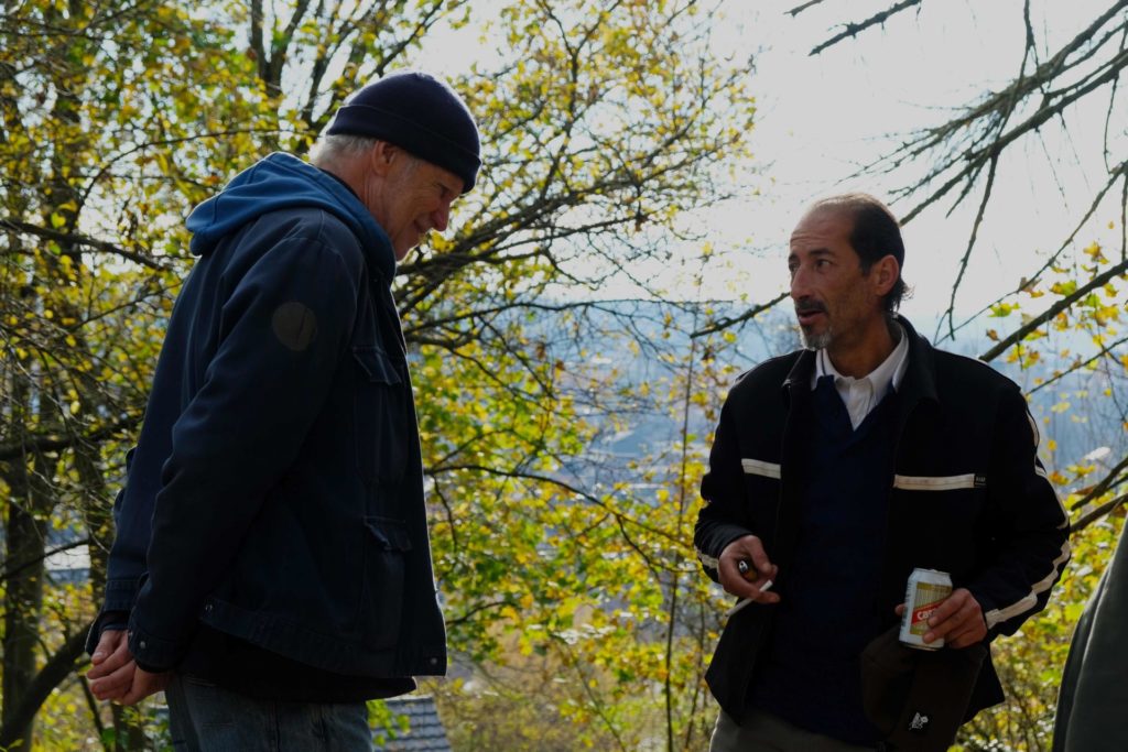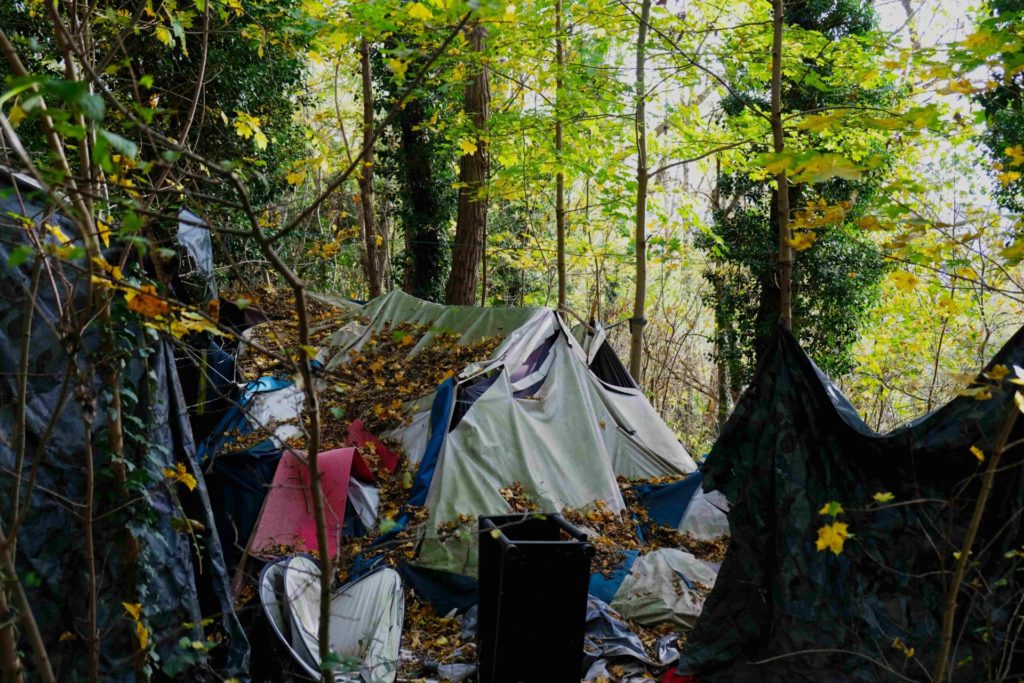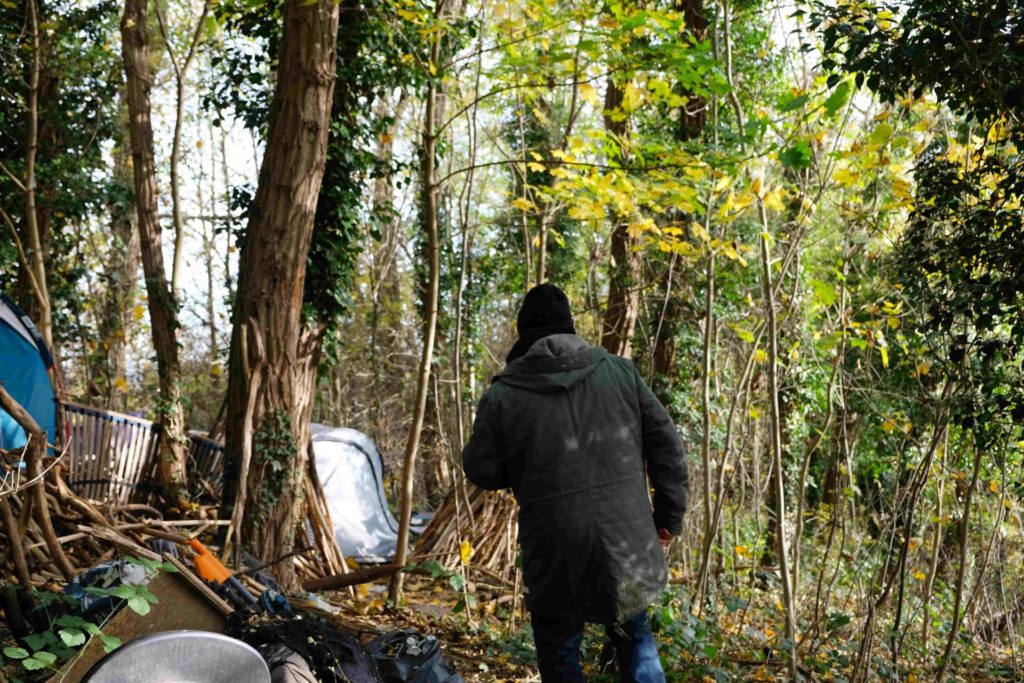 Sur le sentier, on croise un vieil homme. Téléphone à la main, il photographie les tentes une à une. « C’est la première fois que je vois ça », me glisse Philippe à voix basse. L’homme, surpris dans sa tournée, relève la tête et nous fixe. « Moi, c’est Albert, je viens de la part de la police », dit-il simplement. Je remarque alors son prénom écrit en rouge sur le talkie-walkie accroché à sa ceinture. Philippe fronce les sourcils : « Ils vont les déloger ? » Albert hésite, puis répond : « On leur demande juste d’être propres… Si ce n’est pas le cas, alors oui, ils devront partir. » Puis ajoute comme pour s’excuser : « Vous savez, je suis pensionné dans deux mois. Je fais juste ce qu’on me dit. »