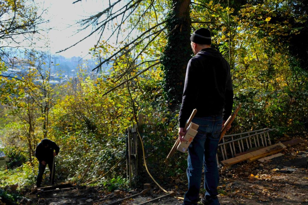 Et puis il y a Noureddine, le futur propriétaire de cette « maison en bois ». Clope au bec, il pioche et bêche pour transformer la terre en de futurs escaliers. « Faudrait pas que je me pète la gueule en rentrant le soir », dit-il en s’épongeant le front.