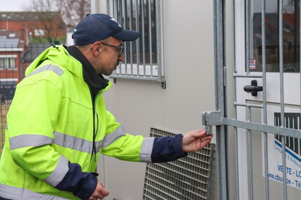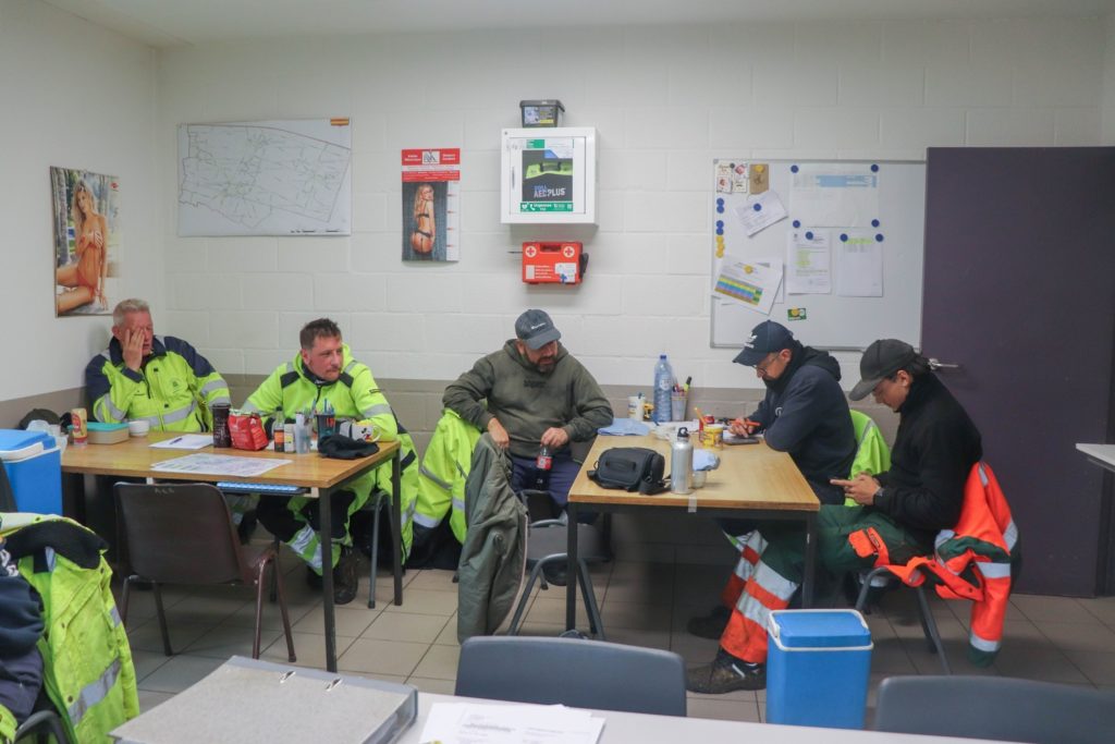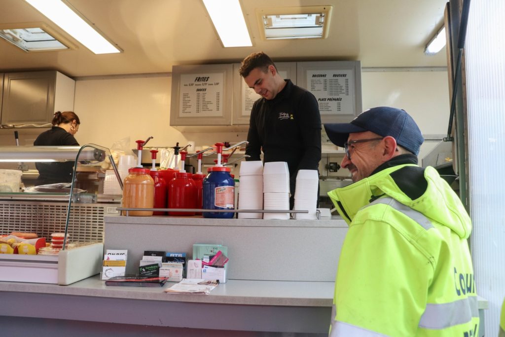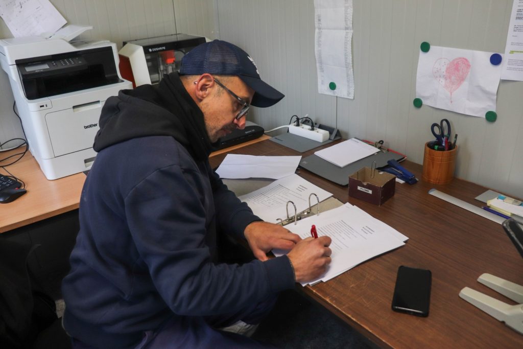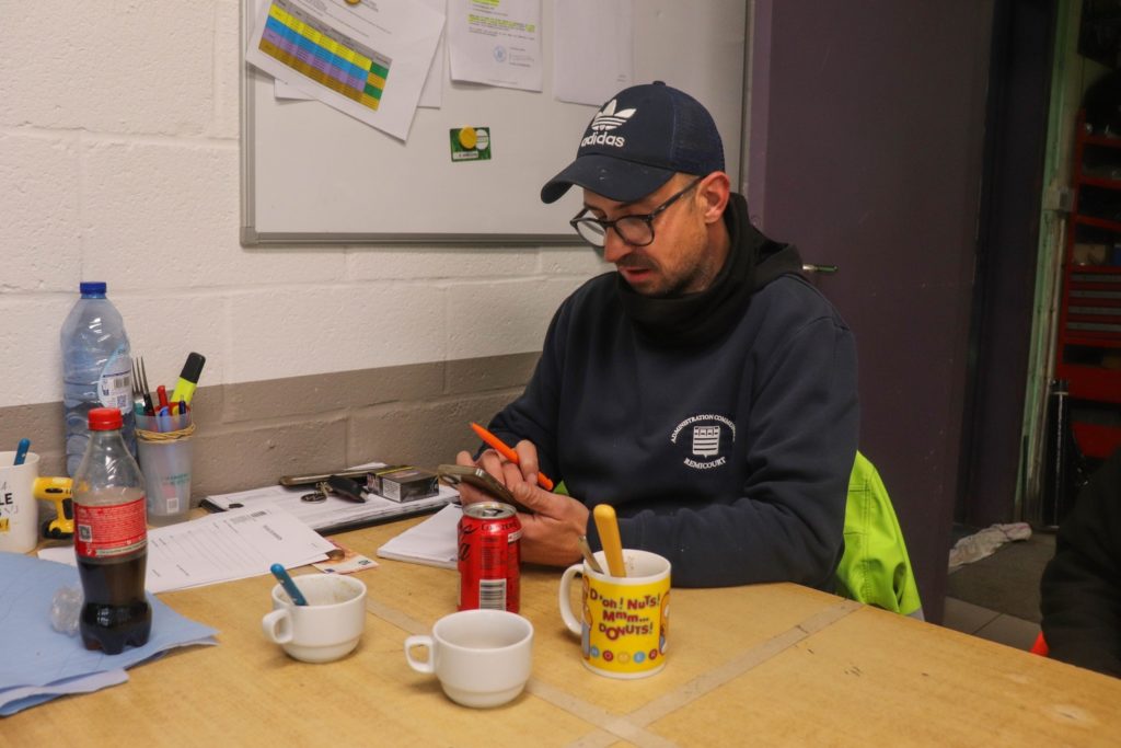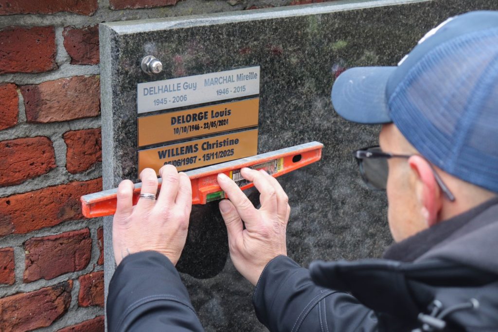 Le mercredi, la pause de midi rassemble les collègues autour des frites au dépôt. Après cela, vient l’une des dimensions les moins visibles du métier : l’administratif. À côté du dépôt, Samuel travaille dans un petit bureau, où sont regroupés les plans détaillés des cimetières, ses diplômes de formation, l’armoire contenant l’équipement pour les exhumations, et, sur son ordinateur, le programme Saphir, qui centralise toutes les données funéraires. Emplacement précis, état des tombes, profondeur, places restantes : tout est répertorié avec rigueur. Ces informations permettent d’anticiper les besoins et d’éviter toute erreur lors des cérémonies. « L’ancien fossoyeur ne faisait pas bien son job, j’ai donc du tout réorganiser », dit-il. Les fiches complètes sont transmises une fois par mois à la commune. C’est également dans ce bureau qu’il grave les plaques à mettre devant les espaces de dispersion. Il s’occupe justement de graver la plaque pour la cérémonie de demain, mais s’y prend à plusieurs fois car elle glisse dans la machine.