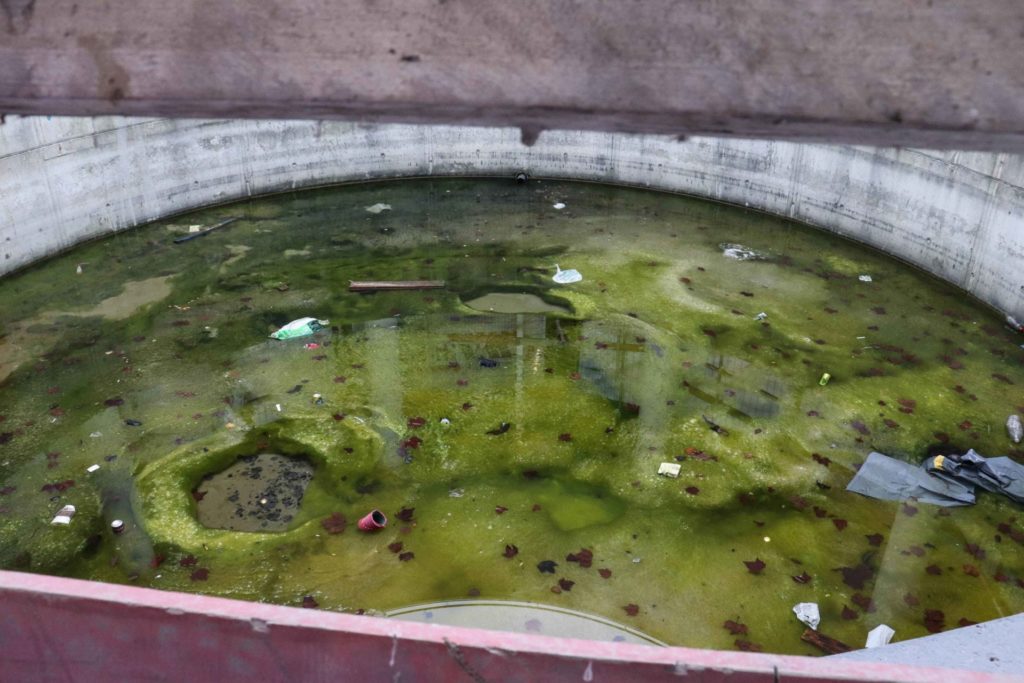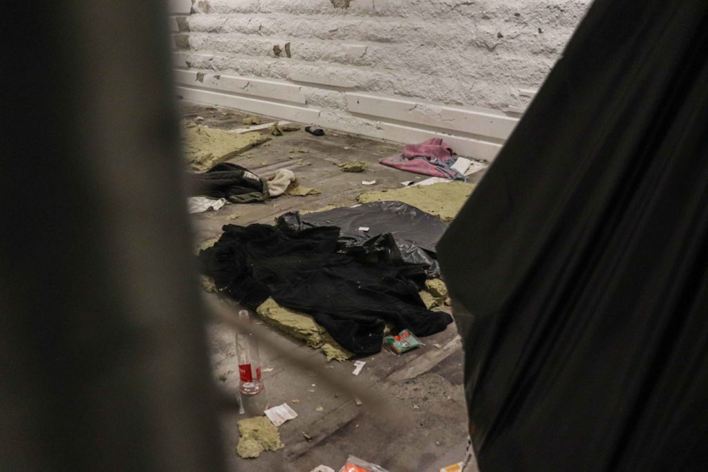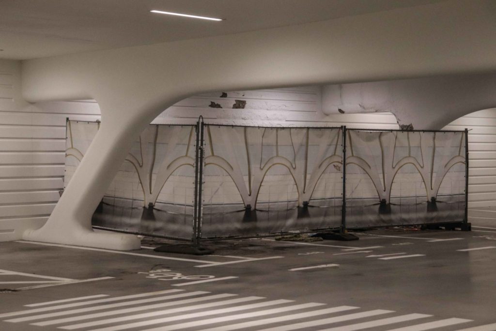 « Presque » est sans doute le mot adéquat. Il suffit d’aller au parking gratuit situé au sous-sol pour voir les cache-misères qui s’y trouvent. Des barricades cachent les différents endroits où les sans-abris ont trouvé refuge. On y retrouve des matelas éventrés, des déchets dont une bouteille vide de vodka aromatisée aux fruits rouges, des couvertures et sacs qui traînent. Plus loin, se cache derrière d’autres barricades une sorte de mare ressemblant à un cratère, dans laquelle s’est accumulée de la vase verte mélangée à un tas de déchets.