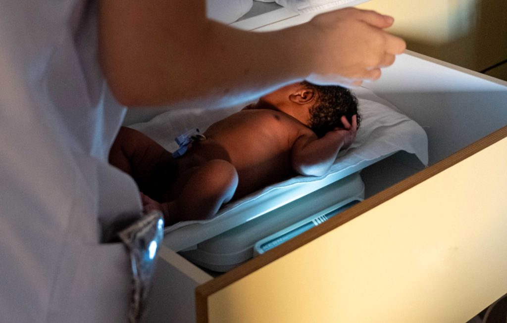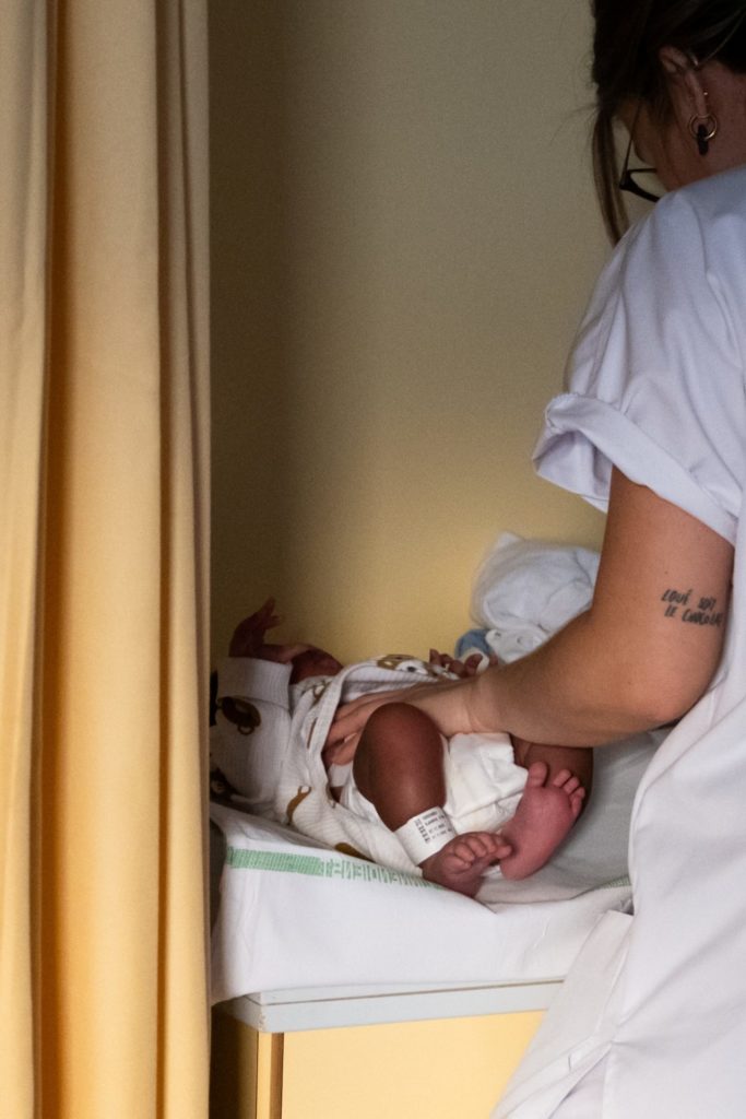 Clémence entre dans la chambre 2 avec un grand sourire. Elle sait qu’elle a un certain nombre de soins techniques à faire avant midi. Mais dès qu’elle ouvre une porte, les chiffres s’effacent. Ici, maintenant, elle doit être entièrement là. Pour la mère fatiguée, perdue mais heureuse, pour le nouveau-né fragile. Elle est la cheffe d’orchestre de ce chaos intime.