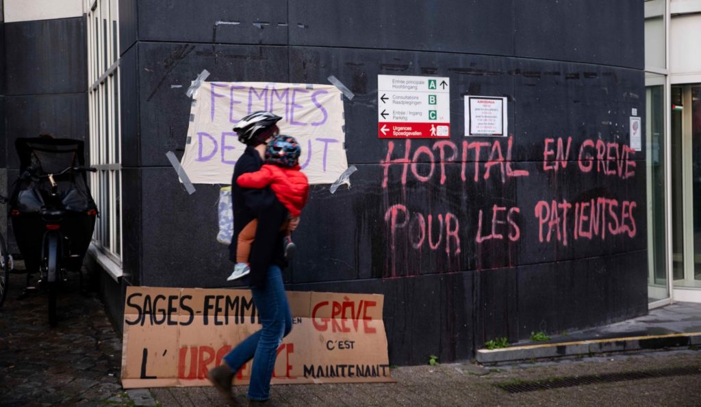 Il est 16 heures. Devant l’immense bâtiment du CHU Saint-Pierre, rue aux Laines 105, une tonnelle rouge, usée par les intempéries, abrite un groupe de sages-femmes. Elles tiennent un piquet de grève devant l’hôpital pendant 36 heures, pour protester contre les mesures du gouvernement Arizona. La statue à côté d’elles a été habillée pour l’occasion d’un drap blanc, marqué de ces 31 lettres capitales : « La maternité n’est pas une entreprise ! »