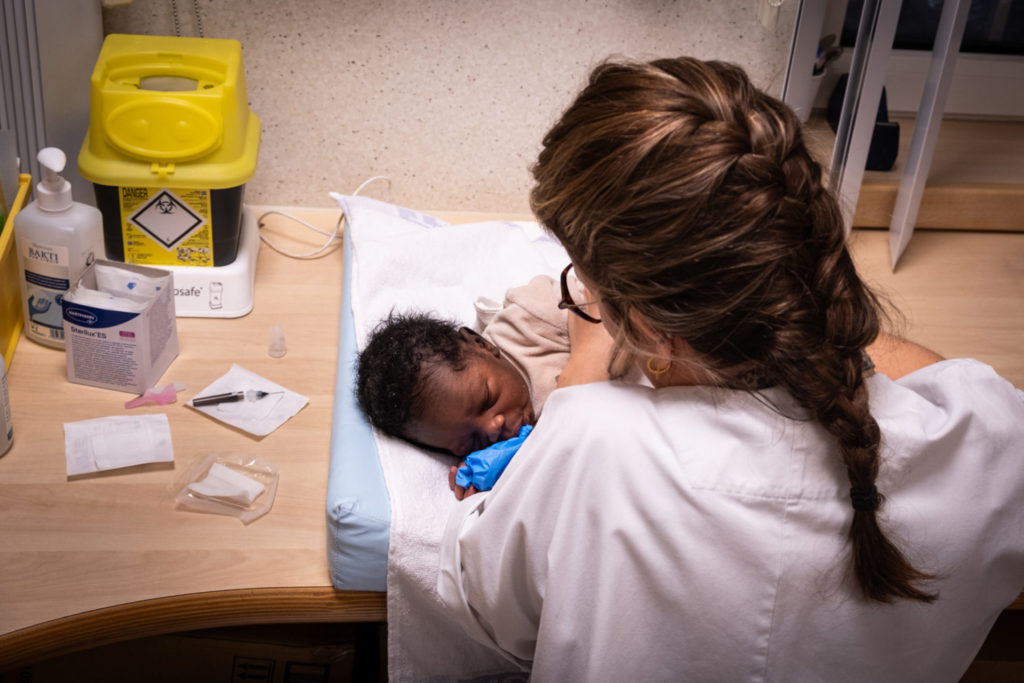 Cette nuit, elles seront trois sages-femmes pour douze mères et douze nouveau-nés. Clémence commence son tour par la chambre une. Elle entre presque sur la pointe des pieds, pour ne pas trahir le calme de la nuit. La jeune mère est au téléphone avec sa fille de cinq ans. C’est son voisin de chambre, à Fedasil, qui la garde en attendant son retour. La mère lui adresse un bonne nuit tendre et des embrassades virtuelles. Clémence sourit. « Bonjour Madame. Comment allez-vous ? Je dois faire une prise de sang à votre bébé, vous voulez venir avec nous ? » Clémence a lu la situation psychosociale de la mère. Elle sait qu’elle était réfugiée en Suède, qu’elle est arrivée en Belgique pour fuir un homme violent, le père du bébé.