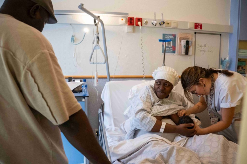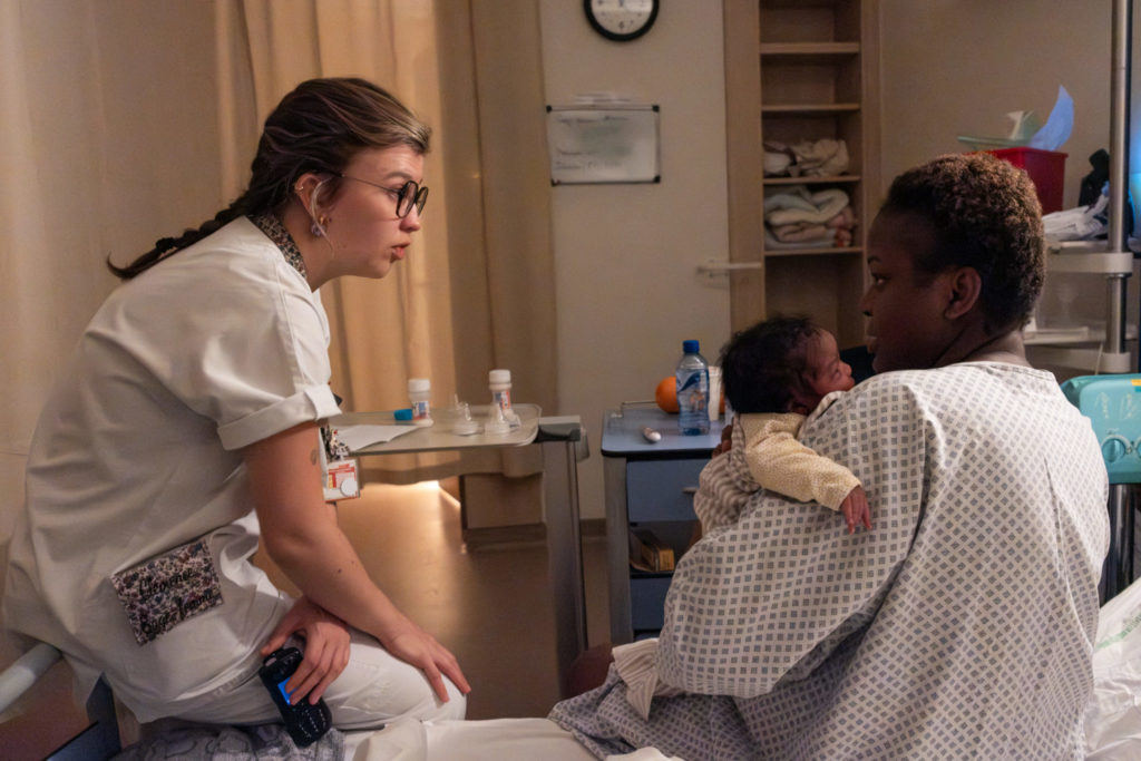 Madame a accouché hier d’un petit Ethan, par césarienne. Elle n’arrive pas à allaiter : chaque fois que l’enfant essaye de lui arracher une goutte de lait, elle se tord et gémit de douleur. Clémence pose une main réconfortante sur le front de l’enfant, explique à la mère quelle position adopter, comment bien placer la bouche du bébé. Et elle reste, autant qu’il le faut. Dans la chambre d’à côté, Clémence recommence : « Bonjour Madame ! Je suis Clémence, votre sage-femme pour la journée. Comment vous vous sentez ? » La jeune mère ne répond pas et se tourne vers son mari, assis sur un fauteuil à côté d’elle. Barrière de la langue. Son mari, lui, parle français. Il s’occupera de traduire les questions et les conseils de la sage-femme. Soudain, le père s’inquiète « Heu, madame. C’est pas le bon nom de famille. » Une étiquette entoure la minuscule cheville d’Ousmane. Accolé à son prénom, le nom de famille de la mère. La sage-femme répond : « Oui monsieur, c’est normal. Ici, on met toujours le nom de la mère. Mais pour son nom officiel, vous pouvez choisir à la commune. »
