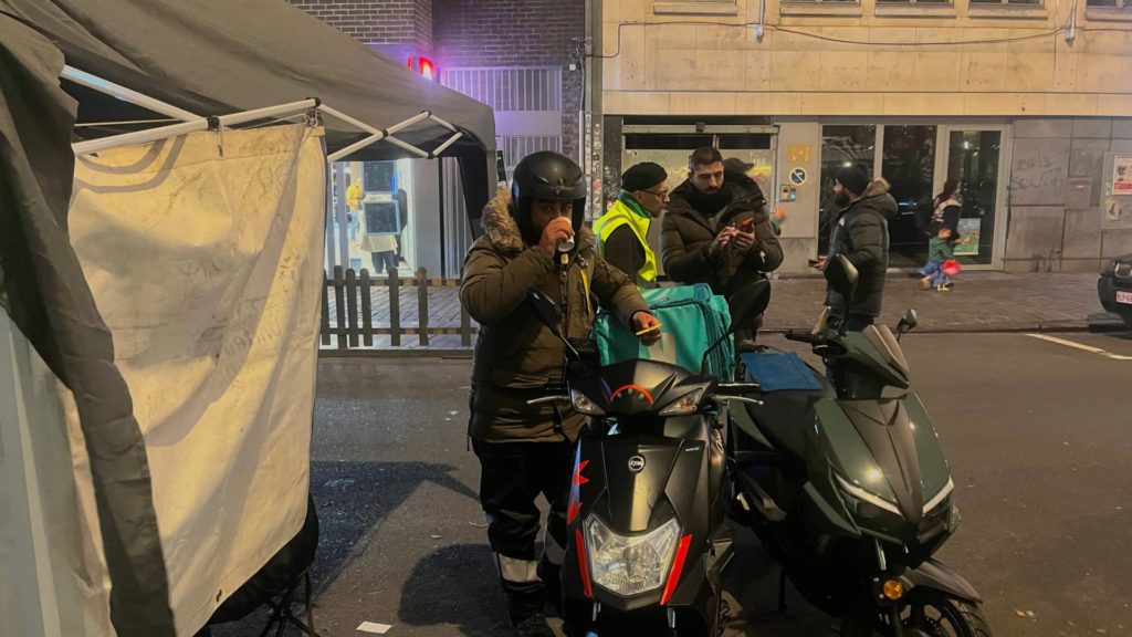 Aux alentours de 20h, Abdelhak parque sa moto à proximité de la tente. Il dit dans un anglais approximatif « venir pour un ami qui a un souci, et qui va bientôt arriver ». Tout sourire, l’homme d’une quarantaine d’années se réchauffe avec un café et un biscuit. Pourtant, il a dû fuir il y a 10 ans les Talibans en Afghanistan pour se réfugier en Belgique. « Ils m’attendaient chez moi. Je n’ai plus vu ma famille depuis. » Il se plait ici, et son travail aussi même si « c’est fatiguant et assez dangereux ».Puis, il scrute son smartphone et accepte aussitôt une commande. Il encode l’adresse de son prochain client et saute sur sa bécane pour sillonner une nouvelle fois les rues de Bruxelles.